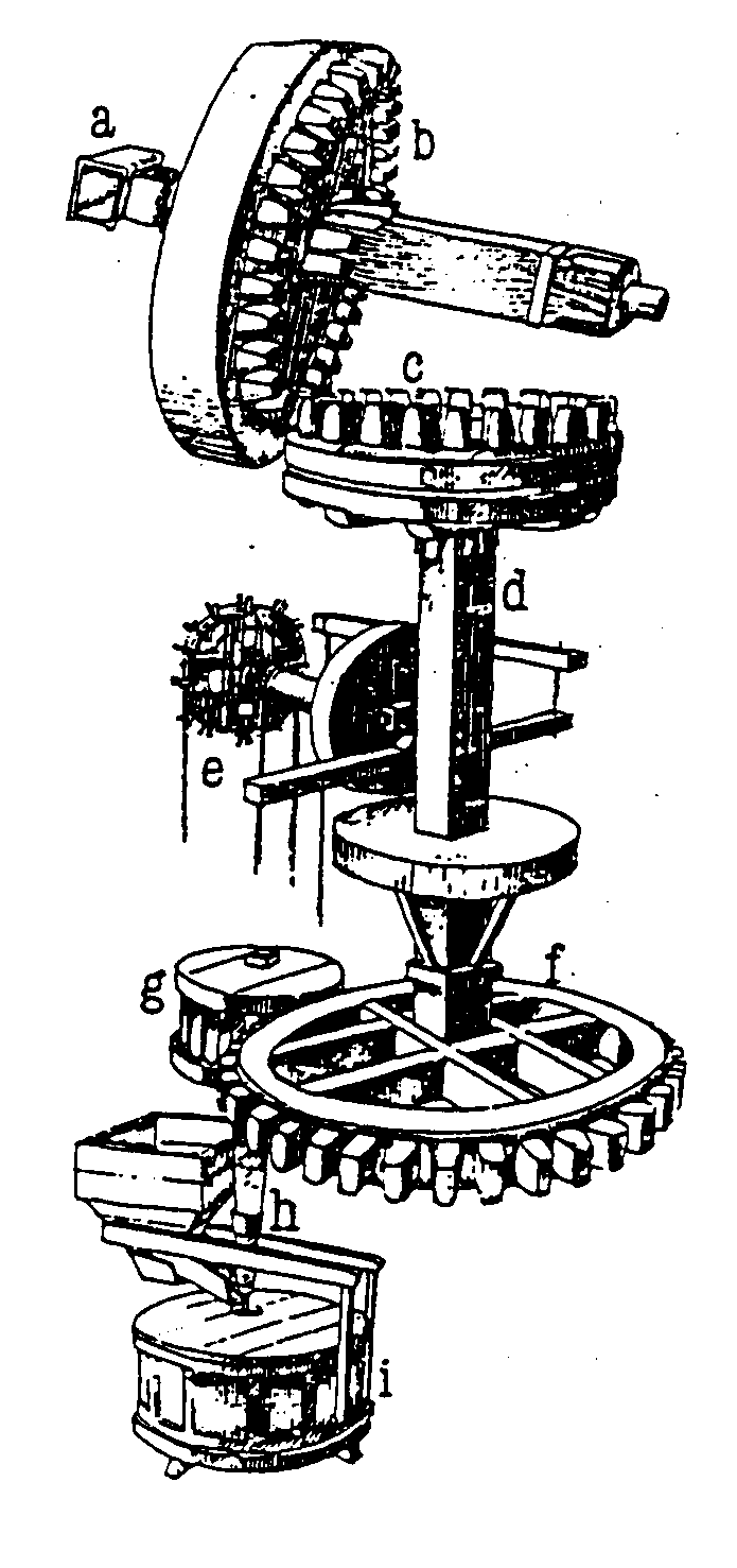Nog weer een stuk lager zit het spoorwiel (f), dat de draaiing weer door geeft aan het rondsel of steenschijfloop (g). Hierdoor gaat de steenspil (h) draaien en ook de bovenste molensteen, de loper.